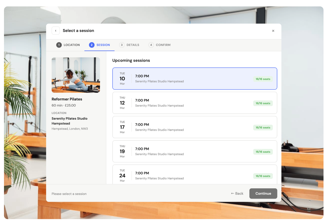 You set the capacity limit for each class. WellnessRooms tracks bookings in real time and automatically prevents overbooking. Members see how many spots are left when they book.